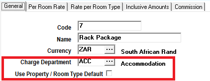 The General tab will display the main charge department that the rate code posts and where the inclusive amounts are distributed off of: