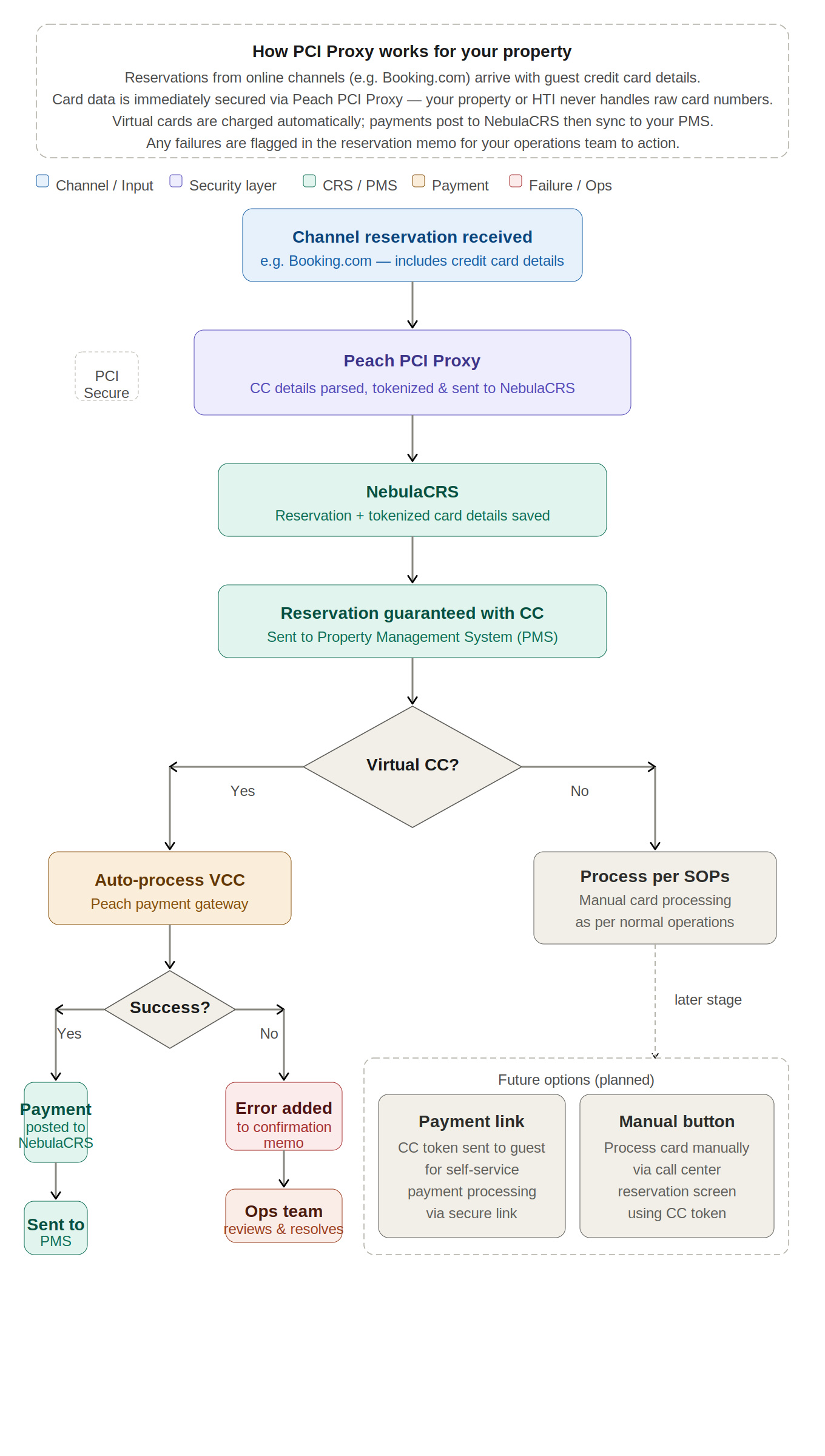 A: Reservations from online channels (e.g. Booking.com) arrive with credit card details. Card data is immediately secured via Peach PCI Proxy — your property or HTI never handles raw card numbers. The details are tokenized and stored securely in NebulaCRS. The reservation is then guaranteed and sent to your PMS. Virtual cards are charged automatically via NebulaPAY, with payments posted to NebulaCRS and then synced to your PMS.